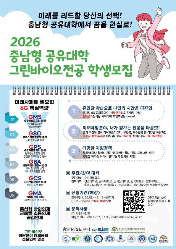 충청남도 지역혁신중심 대학지원체계(RISE) 사업의 일환으로 운영되는 충남 RISE 공유대학에서 2026학년도 그린바이오융합전공 참여 학생을 아래와 같이 모집하오니, 관심 있는 학생들의 많은 참여 바랍니다.