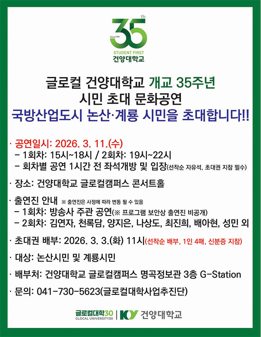 글로컬 건양대학교 개교 35주년 시민 초대 문화공연 국방산업도시 논산·계룡 시민을 초대합니다!!