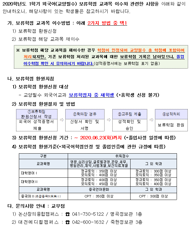 | 제목 | 2020학년도 1학기 외국어교과(교양필수) 보류학점 교과목 이수 안내 | ||||