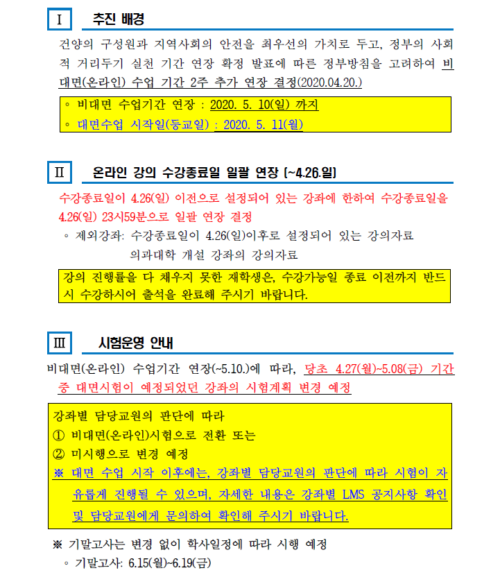 제목 2020학년도 1학기 비대면(온라인) 수업기간 장기화에 따른 학사운영 안내