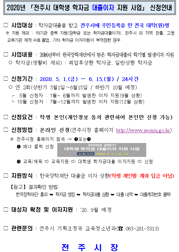 2020년 「전주시 대학생 학자금 대출이자 지원 사업」 신청안내 글의 상세내용