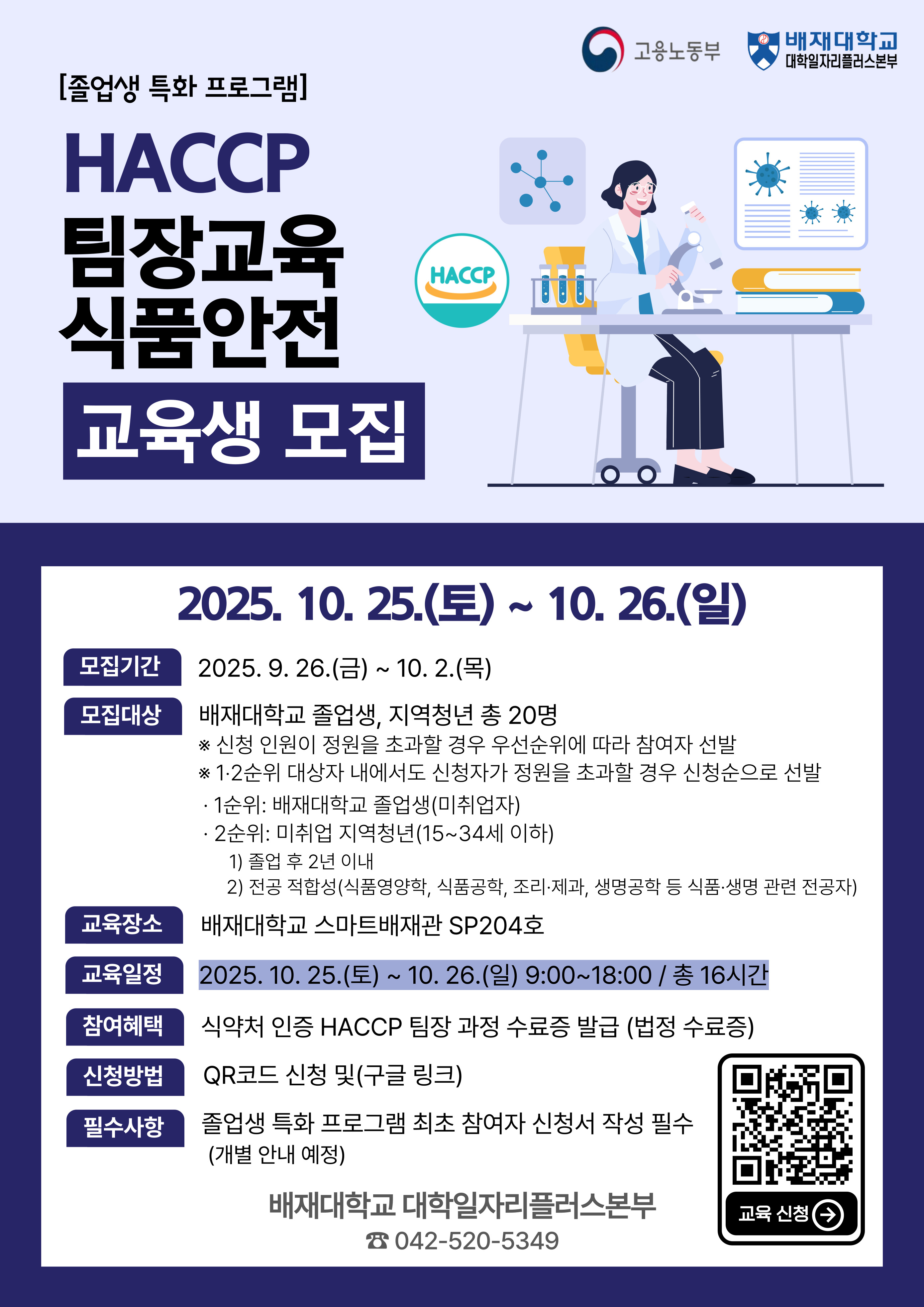 가. 프로그램명: [졸업생 특화 프로그램] 2025학년도 HACCP 식품안전 팀장교육 나. 교육일자: 2025. 10. 25.(토) ~ 10. 26.(일) 다. 교육시간: 9:00 ~ 18:00, 1일 8시간, 총 16시간 라. 교육장소: 배재대학교 스마트배재관 SP204호 마. 모집기간: 2025. 9. 26.(금) ~ 10. 2.(목) 바. 선발발표: 2025. 10. 13.(월) 사. 모집인원: 20명 * 신청인원이 모집 정원을 초과할 경우, 모집 순위에 따라 선발 아. 모집순위 · 1순위: 배재대학교 졸업생(미취업자) · 2순위: 미취업 지역청년(15~34세) 1) 졸업 후 2년 이내 2) 전공 적합성(식품영양학, 식품공학, 조리·제과, 생명공학 등 식품·생명 관련 전공자) * 1?2순위 대상자 내에서도 신청자가 정원을 초과할 경우 신청순으로 선발 자. 참여대상: 본교 졸업생, 지역청년(15~34세) 차. 교육신청: 구글폼 https://forms.gle/NUJETCw2ZMESbUQJA (포스터에 QR코드 참고) 카. 교육혜택: 교육비 무료, 식약처 인증 HACCP 팀장 과정 수료증 발급(법정 수료증)