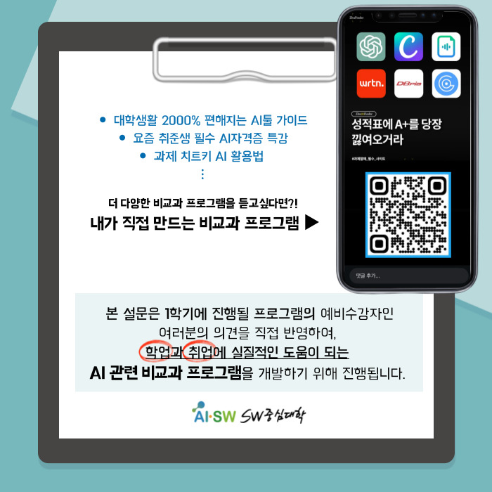 본 설문은 1학기에 진행될 프로그램의 예비수강자인 여러분의 의견을 직접 반영하여, 학업과 취업에 실질적인 도움이 되는 AI 관련 비교과 프로그램을 개발하기 위해 진행됩니다.